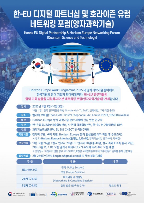 한-유럽 양자과학기술협력센터에서 개최하는 한-EU 디지털 파트너십 및 호라이즌 유럽 네트워킹 포럼(양자과학기술)을 안내해드립니다.